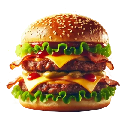 (puffancs, saláta, 2db óriás húspogácsa, sajt, sonka, szalámi, sült bacon, hagyma, ketchup, mustár)