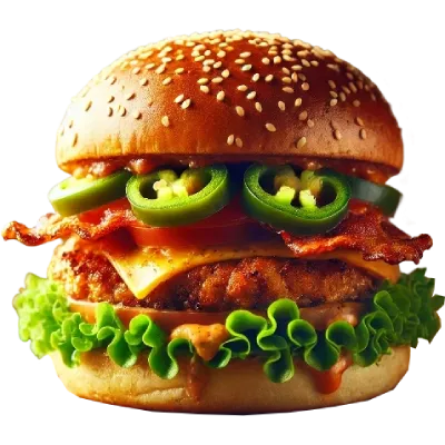 (puffancs, saláta, óriás húspogácsa, sajt, sült bacon, maffia szósz, jalapeno, paradicsom, uborka)
