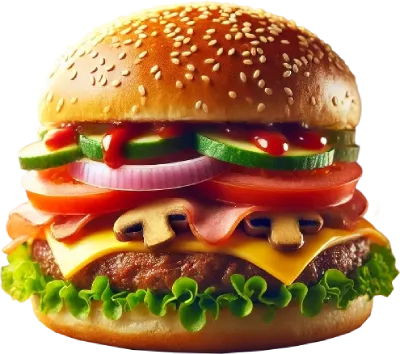 (puffancs, saláta, óriás húspogácsa, sajt, sonka, gomba, hagyma, paradicsom, uborka, ketchup, mustár)