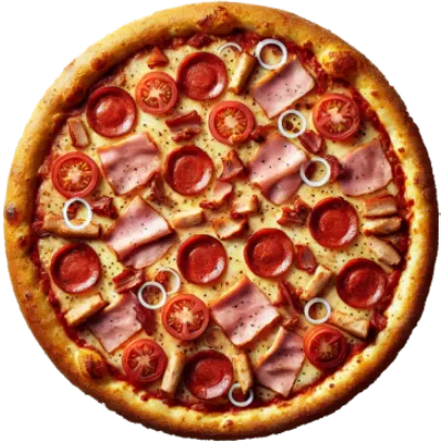 (pizzaszósz, sajt, sonka, szalámi, füstölt tarja, csirkemell, hagyma, paradicsomkarika, bacon)