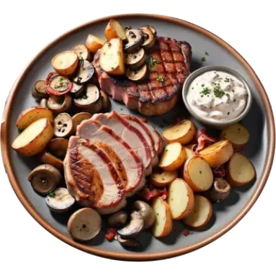 (sertésborda füstölt tarjával, gombával, sajttal sütve, csípős tejföl, fűszeres steak burgonya)