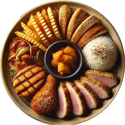(szezámmagos rántott csirkemell, sajttal sonkával töltött sertésborda rántva, roston csirkemell, roston füstölt sajt, vegyes köret, vecsési savanyúság)