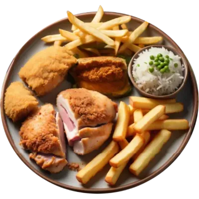 (sajttal-sonkával töltött csirkemell rántva, rizibizi, hasábburgonya)